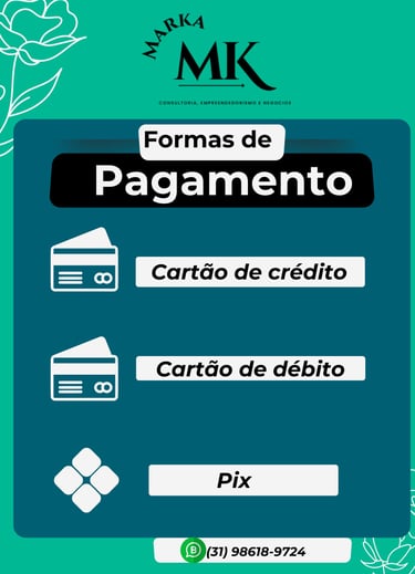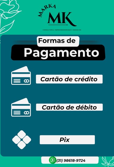 Na Marka aceitamos cartões de crédito, débito e pix por sermos uma loja online. Fica ao seu critério qual meio de pagamento escolher. Qualquer dúvida nos chame no Whatsapp: (31) 98618-9724.